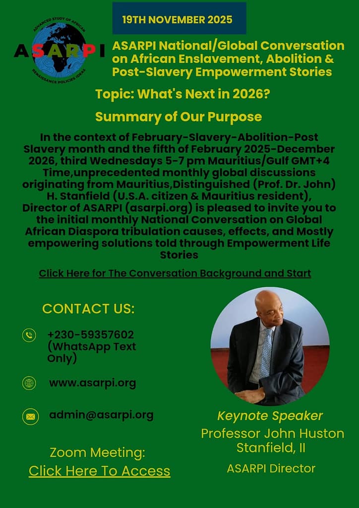 ASARPI, the African Social Responsibility and Public Initiatives, is a global think tank with roots in Mauritius, Namibia and South Africa. Established in 2017 in South Africa, 2021 in Mauritius and 2023 in Namibia by the visionary Prof. John H. Stanfield, ASARPI is more than just a think tank. It's a dynamic force for positive change, led by an African American social entrepreneur, social scientist, historian, and theologian. Prof. Stanfield also served as the 2019-20 SSR Chair of African Studies at the University of Mauritius.
